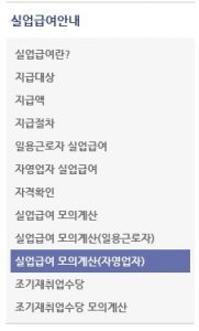 왼쪽 중간쯤을 보면 실업급여 모의계산이라는 메뉴가 보입니다.
